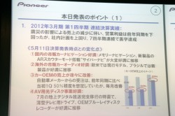 小谷社長は「震災の影響はあったが、日本を挙げて積極的に挽回策に取り組んでいることで改善の兆しが見えておりパイオニアとしても当初の計画を上回る結果となった。通期計画の達成に向け、良いスタートが切れたと思っている。コスト構造の改善により利益が出やすい体質になってきたので、市場が正常化していく2Qのなかで、OEM対応や新ジャンル製品投入、中国市場への積極的進出などを行っていきたい」と締めくくった。