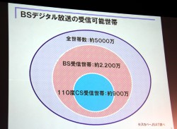 こういった状況の中開局するBSスカパー!に対し、高田社長はスカパー!サービス全体のショーケースとしての機能を大きく期待していると説明。「BSデジタル放送の受信可能世帯は約2,200万で、110度CS受信可能世帯は約900万。この差分である約1,300万世帯にスカパー!サービスを流通させることが我々のミッション」と説明した。「BSスカパー! で採算を合わせなくてはならないとは考えていない」という。