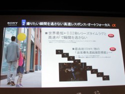 NEX-7と同様に高速応答性能を強化。レリーズタイムラグは0.02秒で、AFの合焦速度もクラス最速レベルの150msを実現した。そのほか、最高約10コマ/秒の速度有線連続撮影機能や、追尾フォーカス機能、8人までの個人顔登録機能を新たに備えた。