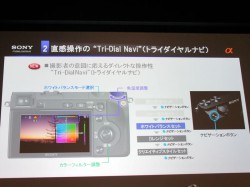大きく進化させたのは操作性。本体上部の2つのダイヤルと、液晶ディスプレイ横のダイヤル、合計3つのダイヤルを使って操作する「Tri-Dial Navi」を採用した。それぞれに好みの設定項目を割り当てることで、基本設定の変更や微調整まで、様々な操作を同時に行うことが可能。従来のユーザーインターフェースでは、深い階層に下りないとできなかった設定を、より簡便に行うことができる。