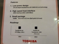 また、現在開発中のLSIや、新LSI搭載SDカードのモックアップ、今後のロードマップの展示も行われた。新型LSIは東芝が開発を進めており、消費電力の低下や通信速度の向上、パッケージの縮小化を実現。2012年度の第3四半期の製品化されるとのこと。さらに同社のロードマップによれば電子決済に対応した新型LSIも2013年に予定されている。