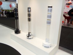 本体にiPhone/iPodが接続可能なドックを備えた、360度無指向性のアンプ内蔵フロアスタンドスピーカーだ。総合出力は120W。本機は背丈が約1.1mと、一般の家庭にも気軽に置くことのできるサイズだ。本体はステンレススチールにガラスパーツを組み合わせたスタイリッシュなデザイン。クロームフィニッシュのモデルは既に発売されており、ブラックとホワイトが秋に追加されるという。