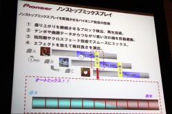 曲調やテンポの近い楽曲を自動的に選曲して、楽曲の盛り上がり部分のみをミックス再生し続ける「ノンストップミックスプレイ」機能を備え、曲を途切れさせることなく音楽を楽しめるのが大きな特徴。曲の盛り上がり部分を検出し、そのテンポや曲調データから、つながりやすい次の曲を自動選曲。スムーズに曲同士がつながるよう、拍を同期してクロスフェードする。クロスフェードする際は自動的にエフェクトをかけ、格好よさを演出してくれる。