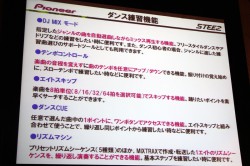 そのほか、同じジャンルの楽曲を選曲してミックス再生する「DJ MIXモード」や、楽曲の設定ポイントから再生できる「ダンスCUE」機能、音程を変えずに楽曲のスピードを調整する「テンポコントロール」機能など、練習に便利な機能も備えている。また、PC内に保存している楽曲を解析して「STEEZ AUDIO」の内蔵メモリーに転送できるPC用楽曲管理アプリケーション「MIXTRAX」にも対応する。