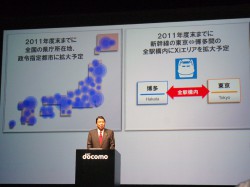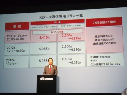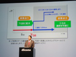 また、Xiデータ通信専用料金プランの提供条件も変更。7GBを超える通信は自動で送受信時最大128kbpsになり、追加料金不要で引き続き利用できるようにする。また来年10月1日から、7GBを超えた場合も、2GBの利用ごとに2.625円を支払うと受信時最大75Mbpsの通信速度で利用可能となるプランも用意する。なお、2012年9月30日までは、7GBを超えても速度変更は行わず追加料金も不要とする。山田氏は、「来年の9月まではお得なので、ぜひたくさんの方に利用してほしい」と語った。