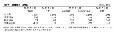 新中期経営計画では、円高の一層の進行など売上面ではマイナス要因が生じているものの、「戦略投資」の成果が期待できることや、2011年度1Qに4事業セグメント全てが営業黒字となるなど順調に推移していることを踏まえ、2014年度の経営目標を売上高4,300億円、営業利益200億円、経常利益140億円、当期純利益110億円に変更する。