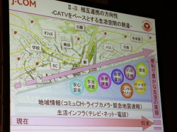 野本氏は「イッツコムは開業してからなかなか利用車が増えず、苦しい時代もあった。20年以上が経ったいま、やっとCATVが情報インフラになったと考えている」とも語った。今回のJ:COMとのYCV共同買収については、「わたしたちは街づくりの視点から、CATVをひとつのツールとしていかに活用するかという視点を持っている。J:COMはCATV事業からいかに生活支援サービスを提供していくかという視点を持っている。『CATVが何をできるか?』という部分で、今回は互いの思いが合意した」と述べた。また「イッツコムの場合、チャンネル数がアナログ40ch、デジタル60chだったが、地デジ移行でアナログの分が空いた。ここで色々な商品を紹介するなど、様々な使い方が考えられる」と説明した。
