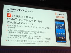 また「こういうのも良いよね、と思った」という富士通製の「ARROWS Z」については、テンキーの上から手書きで文字入力が行えることや、防水仕様の薄型筐体であるといった特長を改めてアピール。田中氏によれば「社員の中では、これが一番良いという声もあるくらい」だという。
