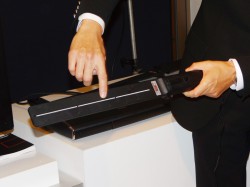 「PhaseGuide sound radiator system」の仕組みはデモンストレーション機材を使って紹介が行われた。ハンディタイプのデモユニットのグリップ部にはスピーカーを内蔵。ユニットの先端部にかけて設けられた音道を伝わったサウンドが、無数に設けられたメッシュ状の穴から指向性をコントロールしてビーム状に出力されるデモが披露された。人間の聴覚特性を応用し、超指向性のサウンドビームと反射の原理を用いて、サラウンド音場を作り出すのが特徴という。