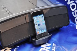 本体後部に搭載するiPodドックにiPhoneやiPodを挿すだけで、プレーヤーに保存した動画・写真を大画面で楽しんだり、ミュージッククリップを音楽付きで再生して楽しむことができる。iPhoneでYouTube動画をストリーム再生しながら視聴することも可能だ。本体には10W×2のステレオスピーカーや、プロジェクターを気軽に持ち運べるよう、本体に向かって右側面にキャリングハンドルも搭載した。