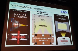 設置性能の優位については、8畳の部屋でも100インチの大画面が楽しめるよう、焦点距離の短いレンズを採用したという。またスクリーンに対して、プロジェクターを真正面に置いた状態でなくても正しい画角の映像が投写できるよう、レンズシフトや台形補正の機能を各モデルの仕様に合わせて搭載したことについても、久保田氏は説明を付け加えた。