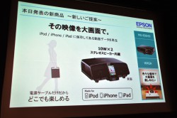 iPhone/iPodドックを内蔵したスピーカー一体型の「MG-850HD」については「どこでも、なんでも、誰でも簡単に楽しめるプロジェクター」が開発のコンセプトだったという。