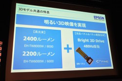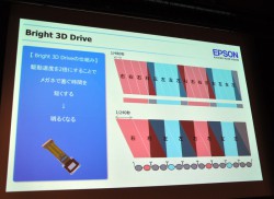 久保田氏は「エプソンでは、3D再生時に確かな性能を発揮できるデバイスの開発が重要なミッションと捉え、今回の製品に採用した最新液晶パネルを開発した。TW8000シリーズでは2,400ルーメン、TW6000シリーズでは2,200ルーメンを超える明るさの光学エンジンと合わせて、これまでにないほどに“明るい3D映像”を実現した」と語り、「Bright 3D Drive」の仕組みを図とともに紹介し、そのメリットを強調した。