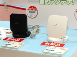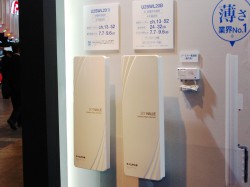 マスプロ電工のブースでは、昨日発売されたばかりの壁面取付用地デジアンテナ“SKY WALLIE”シリーズの新製品「U2SWL20」「U2SWL20B」が展示されている。女性が一人でスムーズに取り付けられるよう、本体形状の小型軽量化を図り、厚さ58mmで質量は既存モデルの半分近い約2.3kgを実現した。