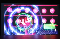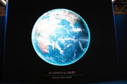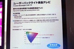 本製品は赤色レーザーと、青色LEDに緑色の蛍光体を組み合わせて発光させるシアン色LEDバックライトを採用し、鮮やかな色と高輝度を実現しているのが特徴。白色LED液晶テレビの約1.3倍の広色域を実現しているという。また、独自のカラーマネージメント技術によって、彩度の高い原色と自然な色再現を両立させた、とアピールしている。同社説明員は「RGB全てにレーザーバックライトを使用するとコスト面の問題が発生する。Rのみレーザーバックライトとすることでも、G、Bのバランスが持ち上げられて高い色再現性が実現できる」と説明していた。本製品の実用化は「できるのならばすぐにでもしたいが、現在価格面などで調整を行っているところだ」とのことだ。