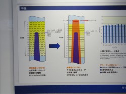 TDKではグルーブレスの16層512GB記録型光ディスクのサンプルを展示している。トラックサーボ用に1層だけ独立したグルーブ付きのガイド層を設けたほか、16層の記録層にはグルーブ層をなくし、512GBの記憶容量を実現。記録層からグルーブをなくすことで、超多層化記録型光ディスクのコストダウンが可能になるというメリットがあるという。同社では2種類の記録層で実用特性を実現したと説明しており、DVD光学系/BD光学系向けの技術として訴求している。