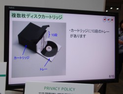 また、光ディスク単体で4層128GB、8層256GBを実現したディスクを、それぞれ20枚使ってカートリッジに収納し、2TB/5.1TBの大容量ストレージを実現する技術の参考展示も紹介されている。ディスク自体は記録層を多層化することにより大容量化。多層ディスクでは反射や透過、吸収のバランスが取れた最適化設計が必要になるため、今回の技術には層の数、最適記録パワーなどを考慮したメディア構成に、最適な光学設計と熱設計を適用しているという。