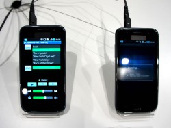 また、JVCケンウッドは「地デジ録画ビデオ対応モバイルDLNAスタック」を参考出展。AndroidスマートフォンをDMSおよびDMCとして使い、DMP/DMRとしてのタブレット端末でコンテンツを再生するというデモを行っている。