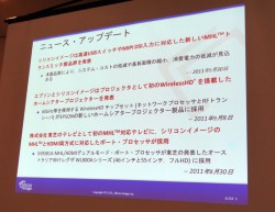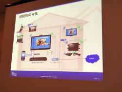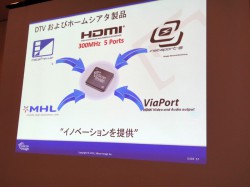 他にもテレビとスマートフォンなどモバイル機器間を接続する規格である「MHL(Mobile High-Definition Link)」の新しいトランスミッター製品群や、エプソンが発表した液晶プロジェクター“ドリーミオ”にも搭載された「WirelessHD」技術の展開(関連ニュース)、並びに東芝がオーストラリアで発表したMHL対応ポート搭載の液晶テレビなどについても紹介が行われた。