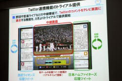 野球や音楽ライブなどの中継番組で、twitterのつぶやきをテレビ画面に表示する機能を8月よりトライアルで提供開始している同社。先日の西武ライオンズvs日本ハムファイターズ戦では、視聴していた25%の会員が連動サービスを楽しんでおり、終了後のアンケートでも80%が「またやって欲しい」という満足感ある回答をしたという。
