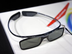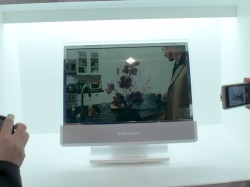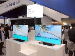 サムスンは、75インチで240Hz駆動の3Dディスプレイなどを参考展示。同製品はアクティブシャッターグラス方式を採用し、コントラスト比5000対1、輝度が450カンデラ。両脇には55インチと46インチモデルも一緒に展示されている。