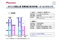 カーナビが国内で好調に推移したが、円高の影響や光ディスクドライブ関連製品の売り上げ減少、カーオーディオのOEM売上減少などにより、連結売上高は前年同期比1.1%減収となった。