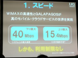 なお発表会にはUQ コミュニケーションズ(株)社長の野坂 章雄氏も出席。野坂氏は、スピードの速さやエリアの広さなどWiMAXの魅力をアピールした。