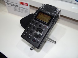ティアックは15日に発表されたTASCAMの96/24対応リニアPCMレコーダー「DR-100MKII」(関連ニュース)を展示した。本機は96/48/44.1kHz、24bit/16bitのリニアPCM(WAV)のほか、MP3形式での長時間録音も行える。本機では新たにロック付きのXLR端子を採用するなど、前機種DR-100を使ったプロフェッショナルユーザーの声に応え、プロの現場でのハンドリングや信頼性を高めている点がポイント。高音質アナログ回路を搭載するなどして、基本的な録音性能も高められている。