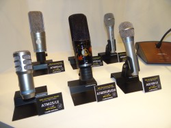 オーディオテクニカは、同社の創立50周年を記念してつくられたヘッドホン「ATH-W3000ANV」、DJ用ヘッドホン「ATH-PRO700MK2ANV」、イヤホン「ATH-CKW1000ANV」、マイクロフォン「AT4050URUSHI」などアニバーサリーモデルをショーケース展示している。残念ながらヘッドホンの試聴を行うためのスペースは用意されていなかった。マイクロフォンについては「AT-PV1000」「ATM98」などハンドヘルドタイプの新製品も注目を集めていた。