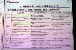 そして、上記の3項目いずれにおいても重要だと位置付けられているのが「戦略的アライアンス戦略の推進」だ。現在本田技研工業、三菱電機、NTTドコモ、シャープなど8社と協業を行っているパイオニア。「結果が既に出ているところも、これからのところもあるが、いずれにおいても協業を積極的に推進していき、新・中期事業計画を達成するための足がかりとしたい」と語った。
