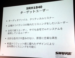 SRH1840は同社のフラグシップヘッドホンという位置づけ。ジョーンズ氏は「本機のターゲットユーザーは2種類」とし、「1つはプロフェッショナル・サウンドエンジニアにアピールしたい。もう1つはオーディオファンで、自宅でハイファイシステムを使用しているユーザーを想定している」とした。