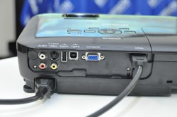 本体背面にはHDMI端子を装備。S映像入力、コンポジット映像入力、アナログ音声入力、PC入力も設けている。他にもタイプAのUSB端子を搭載しており、USBメモリーなどにJPEG写真データを保存し、本機とつないでスライドショー再生が楽しめる。別途設けられたタイプBのUSB端子にはノートPCなどを接続し、映像や音声の転送、プロジェクターのリモコンによるマウス操作などが行える「USBディスプレイ」機能を搭載する。本体には2Wのスピーカーも内蔵する。騒音レベルは最小29dB。