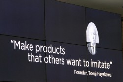 「1912年の創業以来、シャープは常にイノベーションの最先端にいた。創業者の早川徳次が説いた『まねされる商品をつくれ』という思想は今でも受け継がれており、太陽光発電、携帯電話、液晶ディスプレイなど、先進的な製品を次々と世に送り出してきた。シャープの描く夢は大きい。テレビ事業では1983年の3型TFTカラー液晶ディスプレイを、1991年は当時世界初且つ世界最大の壁掛けテレビ“液晶ミュージアム”〈9E‐HC1〉をリリースした。また1966年には当時世界最大の太陽電池を長崎県に設置した。シャープは100年間、大きく考えてきた(Thinking big)。非常に大きい第10世代マザーガラスを採用した液晶パネル工場も保有しており、60型以上のテレビ市場を牽引する存在となっている」と、“Big”という言葉を何度も引き合いに出し、同社の強みをアピールした。