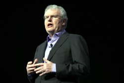 まず登壇したのは同社CEOのハワード・ストリンガー氏だ。同氏はPS VitaやVAIO新モデルといった、今回ブースに登場する新製品を紹介し「これらは新しいユーザー体験を生み出すもの」と語る。また、「Sony Entertainment Network(SEN)」で機器同士が融合・連携することで生まれるメリットをアピールした。同社は今後3年間で、連携機能を持った機器を3億台出荷することを目標にしているという。