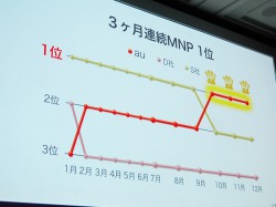 発表の冒頭で田中氏は、2011年にスマートフォンがヒット商品となったことや、同社としては10月にiPhone 4Sの国内販売を開始したことを振り返った。国内主要3キャリアの中で、昨年10月から12月まで3ヶ月連続でMNP 1位となったことを改めて強調し、「auのモメンタムが回復できたと思っている」とした。