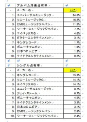 メーカー別売上シェアは、ソニーミュージックグループが19.2%の占有率でトップ。洋楽に関してはユニバーサルミュージックが不動の地位を築いているとしている。また、AKB48が在籍するキングレコードは、シングル売上シェアで1位に躍進した。