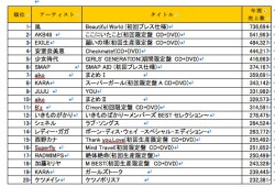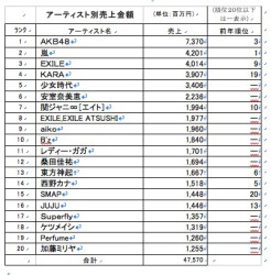 AKB48は、アーティスト別売上金額でも73億円でトップ。なお、前年1位の嵐は2位に後退したが、ヒットチャート部門では邦楽アルバムおよび邦楽シングルともに嵐がトップの売上枚数に。嵐は邦楽アルバム部門で3年連続の売上枚数1位となった。