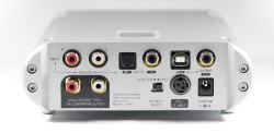 入力端子はアナログRCA×1、光デジタル×1、同軸デジタル×1、USBを装備。出力端子は、6.3mmヘッドホンジャック×1、RCA×1を備えている。本体にはアナログ出力切替スイッチを搭載しており、ヘッドホン/パススルー出力とプリアンプ出力を切り替えて使用することができる。