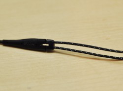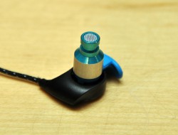 本体はブラックとブルーを基調にシルバーのパーツをレイアウト。ケーブルは外装にドットパターンの布素材を採用した。長さは1.1mで、プラグ部はL字型3.5mmミニプラグ。本体質量は6g。