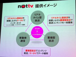 NOTTVでは、月額420円(税込)で3つのチャンネルを使った「リアルタイム視聴」サービスが見放題。3チャンネル以外にも、あらかじめ登録しておいた番組が自動的に端末のメモリーカードに蓄積していく「シフトタイム視聴」サービスや、追加料金を支払うと視聴できるプレミアムコンテンツも用意している。4月1日から開局し、初回申し込みから30日間はサービス利用料無料。なお、対応端末「AQUOS PHONE SH-06D」が3月に発売され、モニターキャンペーンが開始されることに合わせ、3月から試験放送を開始する。