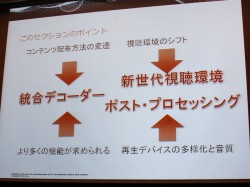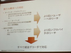 松本氏は、テレビやBDレコーダーなどのAV機器のほか、PCやiOS/Androidデバイスなどに向けた国内の多様な配信サービス、「UltraViolet」などの配信規格を含めた動画配信シーンの現状を示しながら、「DTSの最新技術は、フォーマットの異なるコンテンツプロバイダーの各サービス、また、ユーザーによって異なる視聴環境に対応している」とアピールする。またRoviやDigital Rapidsなどのサードパーティから、DTS対応コンテンツ制作ツールが続々リリースされていることについても、採用エンコーダーでのワークフローなどを交えながら具体的に紹介した。