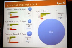 また、“パーソナルクラウドは、2014年までにPCに取って代わり、デジタルライフの中心となる“というガートナーリサーチの予測をひき、「今日発表する新製品は、パーソナルクラウドに適した製品だと考えている。様々なカメラメーカーから、そのメーカー製品に対応したAndroidアプリがリリースされているが、DL数や満足度、レビュー数が群を抜いて多いのがEye-Fiのアプリ。個別のアプリを開発するよりは、Eye-Fiに統一化しませんか、とメーカーに呼びかけているところだ」と、更なる拡大についても意欲を見せる。