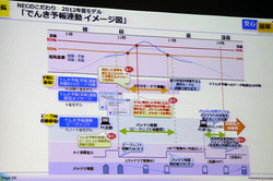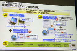 LaVie Eシリーズを除く今回発表された新モデルは、「でんき予報」にあわせてECOモードへの切替えをうながすメッセージを自動表示させる機能や、利用状況が95%を超えると電力使用停止を促すメッセージを表示させる機能を搭載(対象は東北/東京/中部/関西/九州電力地域のみ)。ノートPCの場合はバッテリー駆動への切替えが喚起され、デスクトップPCの場合は休止状態への移行を呼びかけるメッセージが表示される。