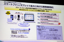 対応するスマートフォンは当初はN-04D、N-05D、N-06Dを予定。なお録画の際は、転送先のスマートフォンが再生できるモード(N-04D、N-05D、N-06Dの場合ファイン〜セミファインロング)で録画しておく必要がある。
