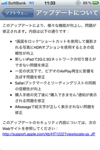 このアップデートでは、iMessageで絵文字が正しく表示されない問題を修正。そのほか新iPadで2Gと3Gネットワークの切替ができない問題や、一定の状況下でビデオのAirPlay再生に影響を及ぼす問題なども修正された。
