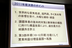 会見に出席した同社の上野山 実氏は、今回の決算のポイントについて、世界的な景気低迷や超円高、タイの洪水などの影響を受け、大幅な減収・減益となったと説明。また、薄型テレビのパネル事業など、課題事業の抜本的な対策と新体制構築に向けた構造改革を行うことで、過去最大の純損失を計上した。