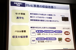 テレビ事業では、昨年度実施した大規模な事業構造改革の成果を今期にしっかり反映させる。テレビセット事業は不採算モデルの絞り込み、原価構築の徹底によるコストダウンの徹底により、黒字化を目指す。またパネル事業は固定費の低減、医療やタブレット、電子黒板など、非テレビ分野へのシフトで収支の大幅な改善を目指していく。