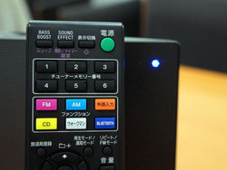 本体前面の右上にはLEDインジケーターを装備。FM時はピンク、Bluetooth時はブルーなどといった具合に、上記リモコンのファンクションボタンと同じ色にLEDが点灯する。