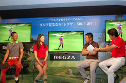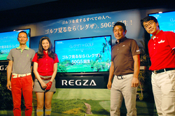 金子柱憲プロは『ゴルフ好きにはレグザで決まり!』というキャッチフレーズを考案。「芝目が読めれば、その人がどういうプレイをするのか予想できて面白い。それに“10秒戻し”は便利ですね。同じシーンを何度も見返すことで、注目する部分を変えて研究することができるので役立つと思います」とコメント。