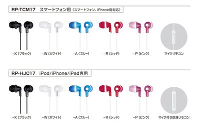 RP-HJC17のマイク付きリモコンはiPhone/iPod/iPad専用に開発されており、音楽の再生/一時停止・音量調整・曲のスキップのほか、iPod shuffle/nanoの音声読上げ機能の操作や、iPod touch、iPhoneのボイスコントロール機能の起動ができる。iPhone接続時はハンズフリー通話も行える。本体には防滴加工を施している。